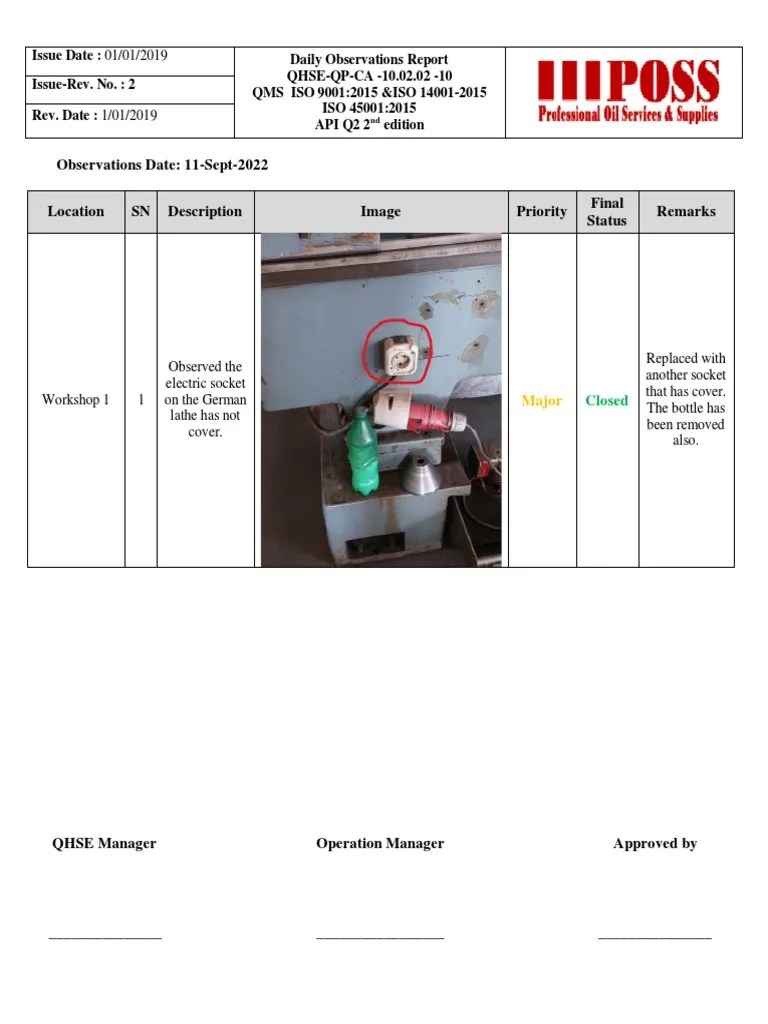 This Daily Observation Report Format Is Specially Designed For The Product Manufacturing Plant Level Observation For Safety And Cleaning That Is Primary.